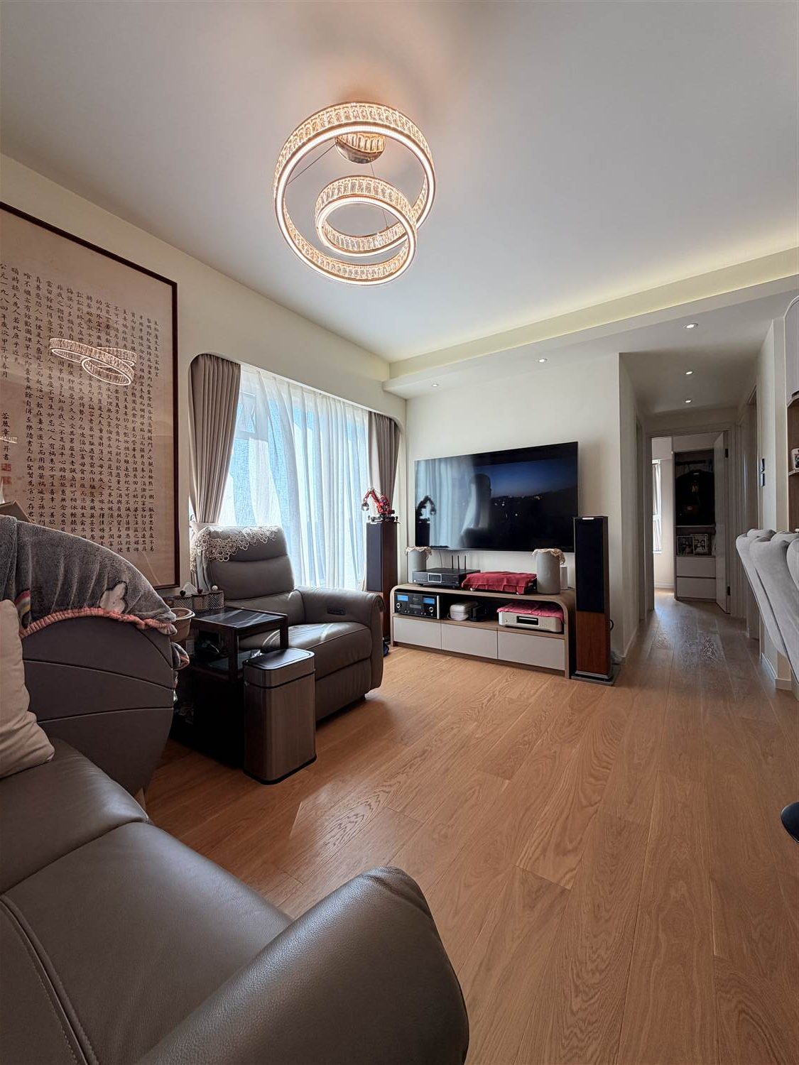 走廊位置及電視櫃設計上,特別採用弧形線條處理,與窗簾殼及天花燈槽的弧形設計相互對應,柔化室內線條,減少直角帶來的生硬感,令整體空間視覺更流暢、舒適且具現代感。