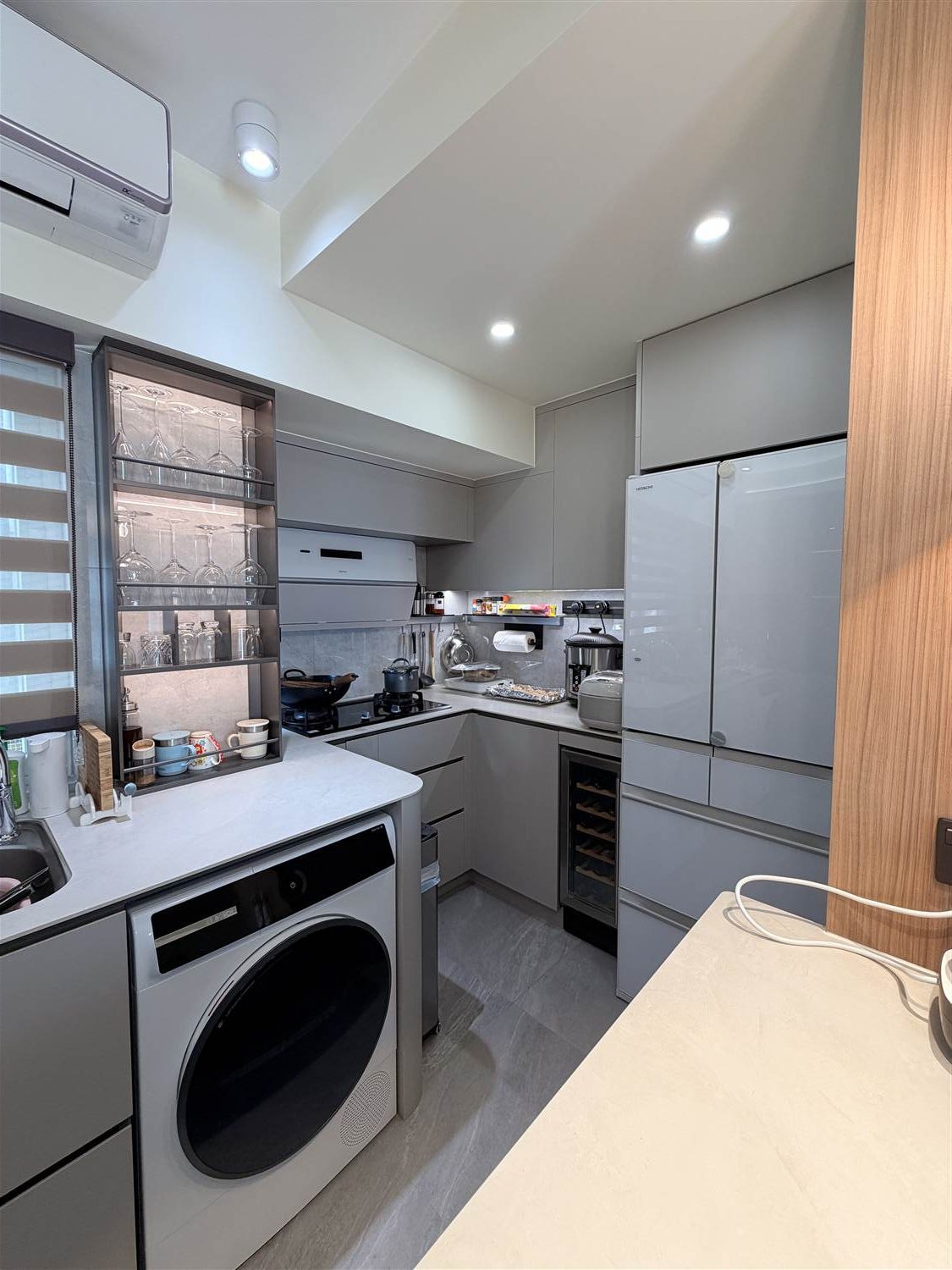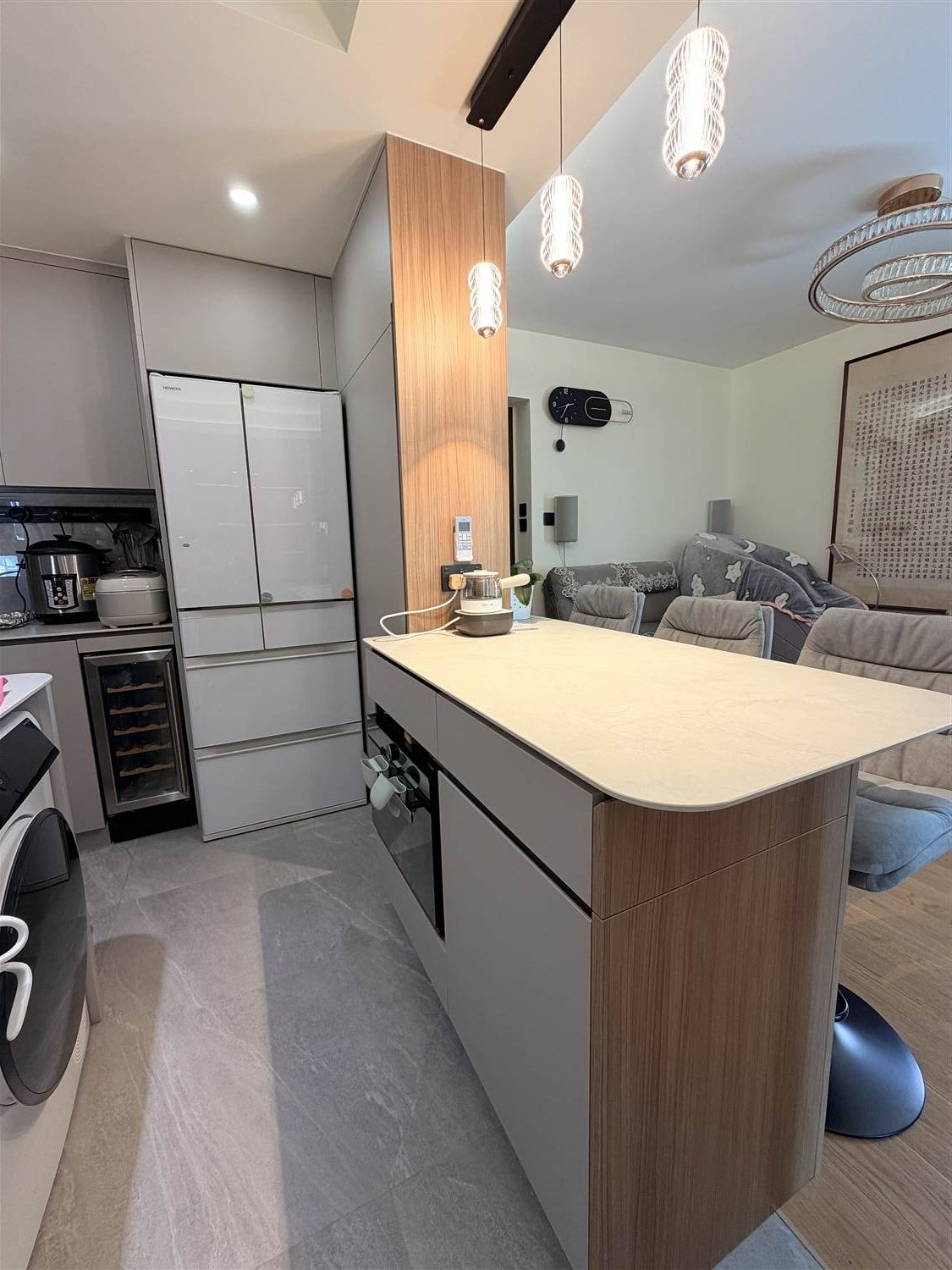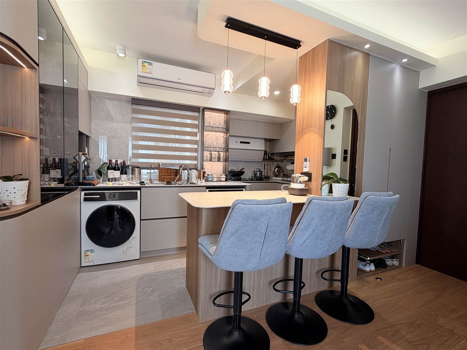 廚房部分,工作枱面選用 Dekton 岩板,具備極高硬度及優越防污性能,耐熱耐刮,特別適合香港家庭高頻率煮食需要。廚櫃門板則採用 台灣 Keding 膠板配木紋設計,細膩自然的木紋質感與全屋地板色調相互呼應,提升整體空間的統一感與高級感。